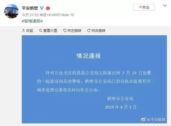 河南省鹤壁市公安局也随即发布通报指出,针对公众关注的淇县公安局北阳派出所7月29日处置的一起盗窃西瓜的警情,鹤壁市公安局已启动执法监督程序,调查处理结果将及时向社会公布。
