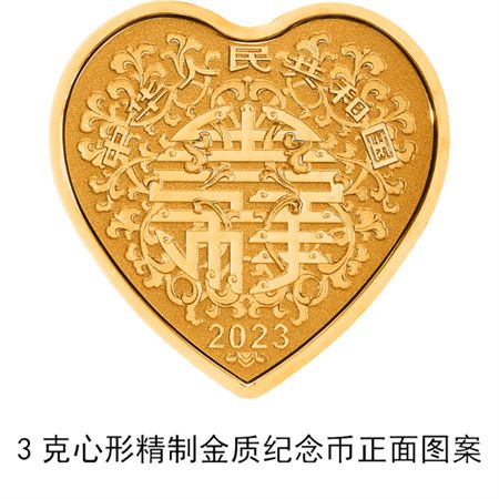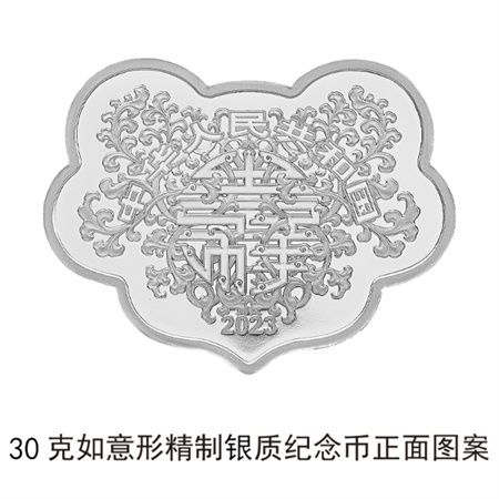 100克圆形银质“人寿年丰”纪念币背面图案为鹤、水稻等装饰组合图案,并刊“人寿年丰”字样及面额。5克如意形金质“前程似锦”纪念币背面图案为马、花卉、树枝、小鸟等装饰组合图案,并刊“前程似锦”字样及面额。30克如意形银质“前程似锦”纪念币背面图案为孔雀、祥云装饰组合图案,并刊“前程似锦”字样及面额。3克心形金质“比翼双飞”纪念币背面图案为双鹤齐飞装饰组合图案,并刊“比翼双飞”字样及面额。30克心形银质“比翼双飞”纪念币背面图案为双鸟、玫瑰、百合等装饰组合图案,并刊“比翼双飞”字样及面额。3克圆形金质“平安喜乐”纪念币背面图案为平安扣、中国结装饰组合图案,并刊“平安喜乐”字样及面额。15克圆形银质“平安喜乐”纪念币背面图案为花瓶、牡丹纹、缠枝纹、蝴蝶等装饰组合图案,并刊“平安喜乐”字样及面额。