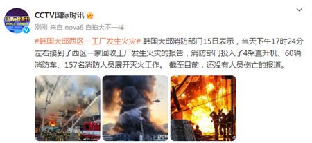 韩国大邱消防部门15日表示,当天下午17时24分左右接到了西区一家回收工厂发生火灾的报告,消防部门投入了4架直升机、60辆消防车、157名消防人员展开灭火工作。截至目前,还没有人员伤亡的报道。