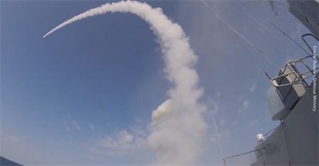 俄国防部公布了一段视频,显示一艘俄军舰发射导弹的画面。RT称,这是俄军对乌克兰“决策中心”实施打击的一部分。图源:俄国防部视频截图