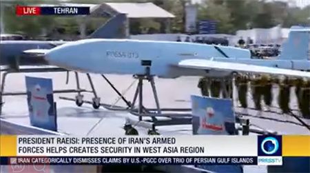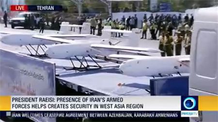 9月22日阅兵式上,伊朗展出的各式无人机视频截图。图源:Press TV