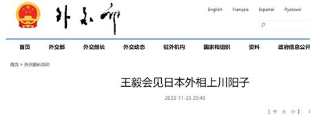 当地时间2023年11月25日,中共中央政治局委员、外交部长王毅在韩国釜山出席中日韩外长会期间会见日本外相上川阳子。