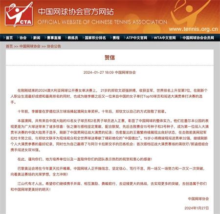 中国网球协会发布贺信:在2024澳大利亚网球公开赛女单决赛上, 21岁的郑钦文顽强拼搏,收获亚军,世界排名上升至第7位,在刷新个人职业生涯最好成绩和最高排名的同时,也成为继李娜之后又一位来自中国的女子单打Top10球员和闯进大满贯单打决赛的选手。
