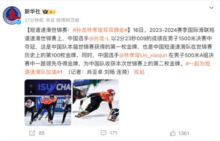 16日,2023-2024赛季国际滑联短道速滑世锦赛上,中国选手孙龙以2分23秒009的成绩在男子1500米决赛中夺冠,这是中国队本届世锦赛获得的第一枚金牌,也是中国短道速滑队在世锦赛历史上的第100枚金牌。