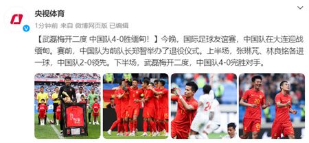 今晚,国际足球友谊赛,中国队在大连迎战缅甸。赛前,中国队为前队长郑智举办了退役仪式。上半场,张琳芃、林良铭各进一球,中国队2-0领先。下半场,武磊梅开二度,中国队4-0完胜对手。