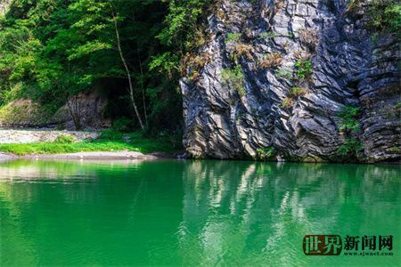 两边高耸的山峰郁郁葱葱,环抱着盘山公路、碧绿的河水......