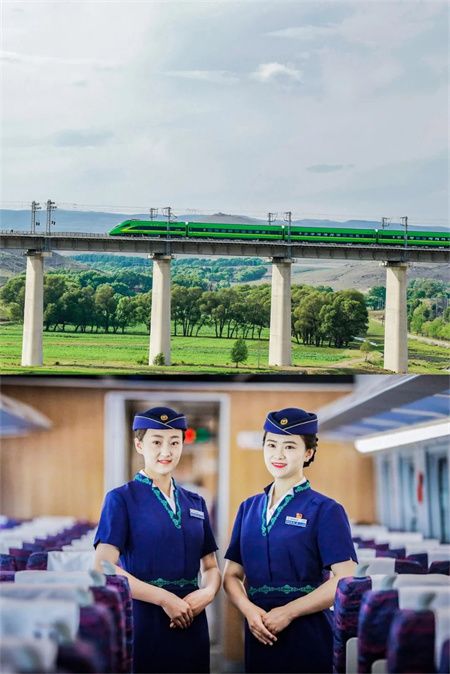 ☘绿色涂装的复兴号动车组列车奔驰在广袤的北疆草原上,拉近了城与城之间的距离。快来乘坐草原城际动车组列车,与热情细致的乘务员小姐姐们不期而遇吧!