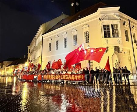 习近平乘车从机场赴下榻饭店途中,数百名当地华人华侨和中国留学生聚集在道路两旁,挥舞中匈两国国旗,举着横幅,热烈欢迎习近平主席到访。
