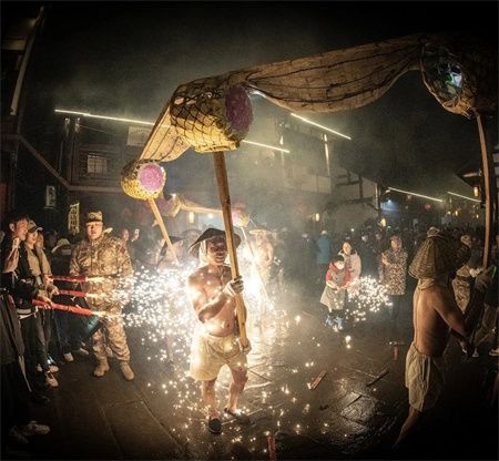 当夜幕降临,华灯初上,石桥镇的街头巷尾变得热闹非凡。人们穿着节日的盛装,手里拿着点燃的香,等待着烧火龙的队伍的到来。只见一条长长的队伍蜿蜒在街头巷尾,每个队员手持火把,将一条巨大的火龙映衬得格外醒目。随着鼓声的节奏,队员们将火把高高举起,配合着节奏舞动起来,仿佛将一条火龙带到了现场。