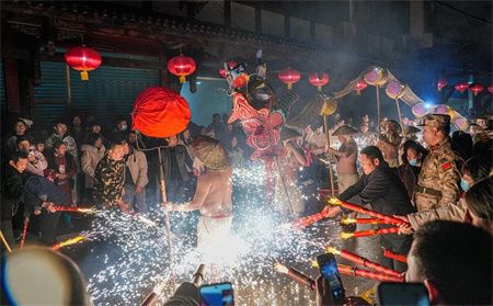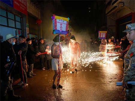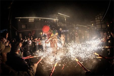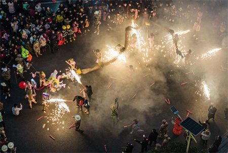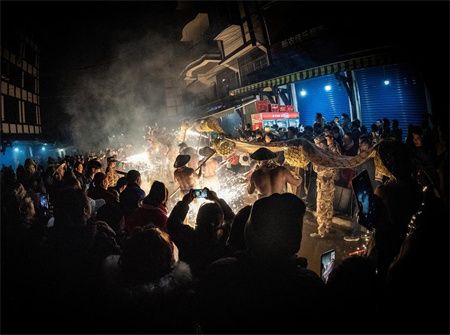 火龙由各种形态各异的道具组成,有金龙、银龙、草龙、纸龙等,这些道具都被点燃了。火光映照在人们兴奋的面孔上,让整个场面变得格外神秘而激动人心。现场的人们不时发出惊叹声和掌声,为这精彩的表演欢呼雀跃。