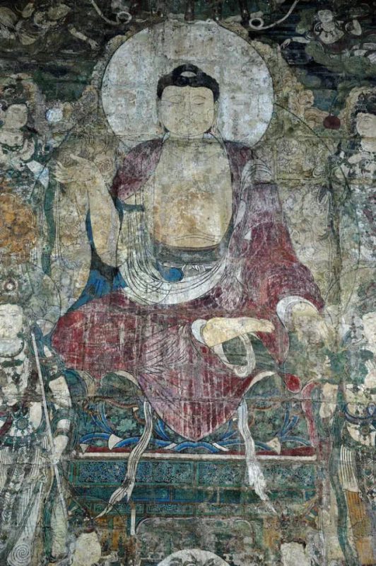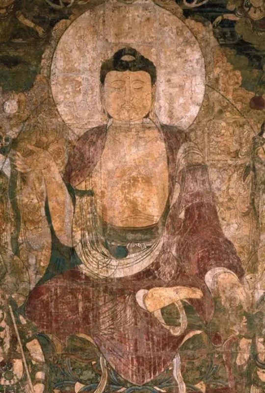 画面正中央是药师琉璃光佛端坐在莲花宝座之上,面相慈祥圆润,仪态庄严,乌发肉髻,双耳垂肩,身披佛衣,坦胸露右臂,左手抚膝,右手结印,双足跏趺坐于莲花宝座中央。此壁画药师佛左手抚膝,与通常看到的药师佛左手捧药器有所不同。