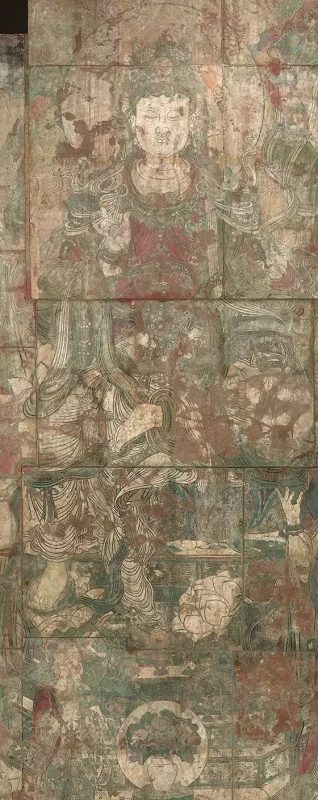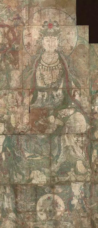 周围又有“八大接引菩萨”站立环绕在“药师三尊”身旁。“药师三尊”莲花宝座下,各有献花供养的二尊菩萨或童子。画面二侧是十二尊药叉神将和护法天神部诸眷属围绕,护持着东方净土。此画场面恢弘,人物众多,色彩繁复,线描精巧,虽经七百多年年沧桑飘移而瑰丽依旧,堪称艺术珍品。
