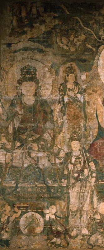 药师佛左右有日光菩萨和月光菩萨结跏趺坐于莲花宝座之上,与药师佛一起形成“药师三尊”,又称为“东方三圣”。